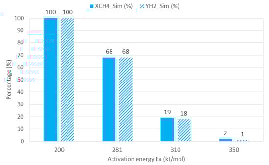 Four different values of Ea were studied (200–281–310–350 kJ/mol) at a fixed temperature (1473.15 K), gas inlet flow rate (0.5 NL/min), and methane inlet mole fraction (0.5). Only electric heating was activated. Results are shown in Figure 6.
