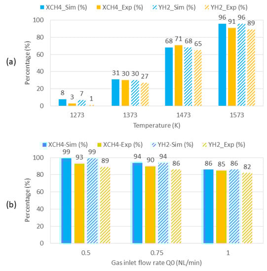 Figure 7 shows the comparison of the numerical model with the experimental performance of the reactor. In Figure 7a, a high degree of coherence can be observed between numerical and experimental results in terms of both methane conversion and hydrogen yield at all temperatures. For instance, at 1373 K, numerical and experimental values of methane conversion and hydrogen yield were very close (XCH4 = 31% vs. 30% and YH2 = 30% vs. 27%). At the other temperatures, the results were also consistent (for example, at 1573 K: XCH4 = 96% vs. 91% and YH2 = 96% vs. 89%). The small gap between simulation and experiments might arise from several factors. In particular, the simulation does not consider partial decomposition of methane, which, in fact, results in some secondary intermediate hydrocarbons (C2H2, C2H4, and C2H6).