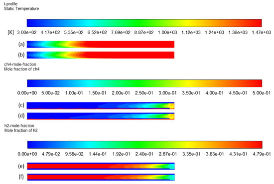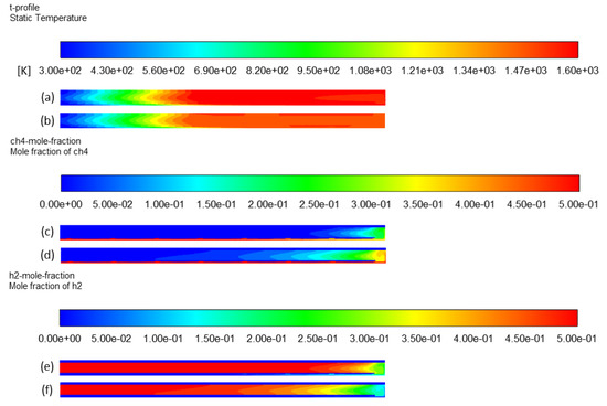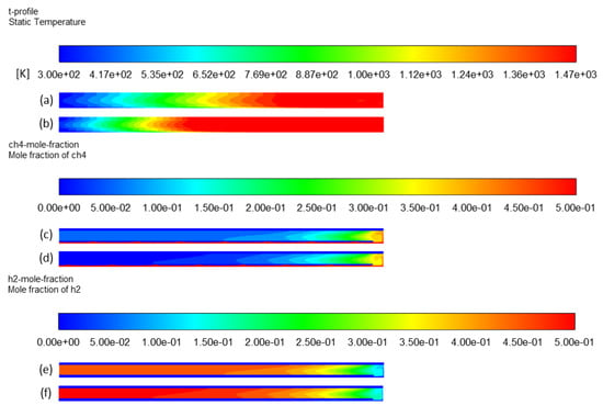 Effect of hybridization on temperature profile: (a) case 2 and (b) case 1; CH4 mole fraction profile: (c) case 2 and (d) case 1; H2 mole fraction profile: (e) case 2 and (f) case 1.