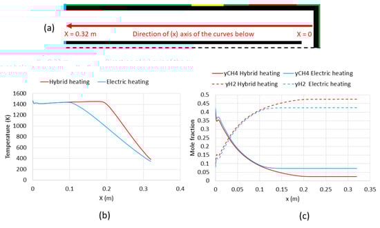 Effect of heating on temperature and outlet mole fractions of methane and hydrogen. (a) Scheme of the reactor annular region including the x-axis of the curves, (b) temperature plot, (c) outlet mole fractions plot.