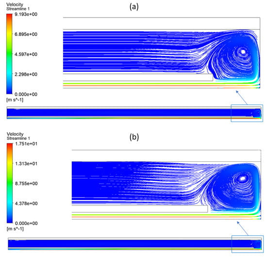 Velocity streamlines in the reactor with a zoom at the bottom part: (a) case 1 and (b) case 3.