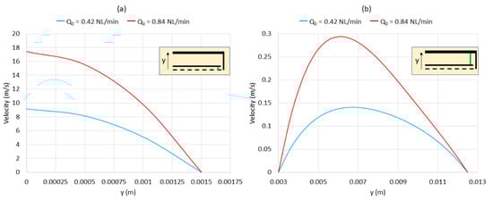 Figure 12 plots the velocity for case 1 and case 3 according to the direction of the y-axis (vertical direction) 20 mm above the bottom of the reactor (i.e., along the green line in the small reactor scheme in Figure 12 that indicates the location where the velocity was plotted). In case 1 (blue curve in Figure 12a), when Q0 was 0.42 NL/min, the maximal velocity in the inner tube was almost 9 m/s at the axis (in the center of the inner tube). This velocity decreased progressively to zero near the walls (at x = 0.0015 m). In the annular space (blue curve in Figure 12b), the same aspect was observed: the maximal velocity was almost 0.14 m/s (at x = 0.0065 m), and it progressively decreased to zero when approaching the walls (x = 0.003 m and x = 0.0125 m). The velocity in the annular space was much smaller than in the inner tube due to the higher cross section.