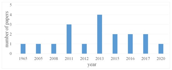 The time-history of the published papers is reported in Figure 1. The figure anticipates one of the results of this review: with respect to the leak case [9], very few experimental papers deal with PB detection by means of transient tests. In such a bleak scenario, the long gap between 1965 and 2005 (40 years!) with no contribution must be noticed, and 2013 is a stand-out year, with four papers. For the sake of clarity and to make the paper easy to read, the selected papers have been grouped into six categories, each of them labeled by a progressive number (Table 1). For some categories, sub-categories have been identified. For category “# 6-PB simulation”, as an example, four subcategories have been considered: in-line valve, orifice, small-bore pipe, and “other types”. Moreover, to make clear the classification criterion, it is worth pointing out that if, as an example, two different devices have been used for simulating a PB in a study, the paper is included in both of the related sub-categories. In Table 2, all the selected papers are listed with their main characteristics indicated according to the identified categories. Finally, in Table 3, the meanings of the abbreviations used in Table 2 are given.