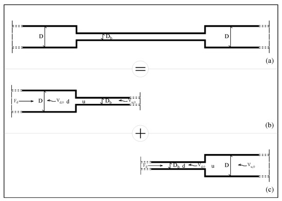 A junction between two pipes [29], where the diameter decreases ( < D) in the direction of the propagation (case of shrinkage-Figure 3b), behaves as the downstream part of a small-bore pipe simulating an extended PB. Assuming that the two pipes have the same Young’s modulus and neglecting the effect on the pressure wave speed of the deposited material that reduces the diameter to , it can be assumed that . At the junction, continuity of flow and commonality of the piezometric head (if the local loss is neglected) allows writing: