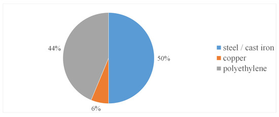 Within TTBTs, the effect of the pipe material is reflected mainly in the value of the pressure wave speed, a. This quantity influences the value of the inserted pressure wave, , and the requirements for the data acquisition system. Precisely, the larger the a (e.g., as in metallic and concrete pipes) and the larger the (for a given velocity change), the larger the sampling frequency needed to capture the behavior of the traveling pressure waves. As shown in Figure 6, the available experiments are shared almost equally between metallic (with very few tests in copper pipes) and polyethylene pipes, whereas no tests have been executed in PVC and concrete pipes. The lack of experiments with PVC pipes can be assigned to the fact that they are usually approximated as the polyethylene ones. The lack of experiments with concrete pipes is due to the fact that almost all available tests have been executed in laboratories where concrete pipes cannot be used because their diameters are usually quite large.