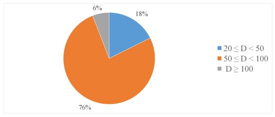 The diameters used in laboratory and field tests have been divided in the following three ranges (Table 3): (i) : 20 mm 50 mm; (ii) : 50 mm 100 mm; and (iii) : D ≥ 100 mm (note that in some cases, the value of the internal diameter is given, whereas in some others, the nominal diameter is provided). Figure 7, where the percentages of such ranges are reported, indicates that most tests (76%) have used the range. As for the pipe material, the lack of tests in large-diameter pipes is due to the fact that very few tests have been executed in real systems. Moreover, the use of a large diameter pipes implies large values of discharge, a feature quite difficult to achieve in laboratories.