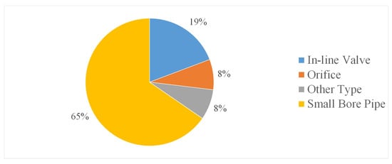 The value of the Reynolds number, = , with = kinematic viscosity, characterizes the pre-transient flow conditions. The available tests have been divided into the following four groups: (i) : = 0; (ii) : 0 2000; (iii) : 2000 8000; and (iv) : 8000. The related percentages, reported in Figure 8, indicate that most tests (50%) have been carried out in turbulent conditions; in tests with , the PPWM has been used. According to [30], where it is shown that the smaller , the more stable the pressure signal, and then the easier the detection of the pressure waves reflected by any fault, it is of interest to execute further tests in laminar conditions. Moreover, to identify the possible mechanisms of interaction with the pressure waves, the characteristics in such conditions of the flow field around a PB—particularly downstream of it—must be investigated by means of appropriate tools (e.g., three dimensional computational fluid dynamics (CFD) models [5,31]).