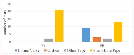 In this section, the characteristics of the devices used in the experiments to simulate PBs are described. In the available experiments (Table 2), four types of devices have been identified (Figure 10): (i) in-line valve, (ii) orifice, (iii) small-bore pipe, and (iv) “other types” (i.e., irregular rock aggregate or rough coconut coir [12]; very short PB and longitudinal-body PB—Figures 3 and 4 in [19], respectively). As shown in Figure 10, the most used device is the small-bore pipe, which captures indeed the characteristics of the real “extended” PBs [32]. Figure 11 shows that most tests have been executed in polyethylene pipes with a PB simulated by a small-bore pipe.