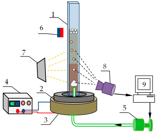A flat glass channel 1 (2 mm thick), installed vertically using a non-magnetic fastener system, is filled with an MF sample. The top of it is filled with a layer of non-magnetic phase with the help of a syringe. An annular permanent magnet 2 (NdFeB 60 × 24 × 10 mm) placed on top of electromagnet 3 is used as a source of an inhomogeneous magnetic field. Taken together, they form a combined magnetic field source, which is located coaxially with the channel axis and connected to a power source 4 to change the magnetic field’s intensity. A syringe pump tube 5 is used to supply gas or fluid to the ‘magnetic vacuum’ region [33,34]. A permanent magnet 6 can be moved towards this region to study the impact of an external magnetic field on the dynamics of bubbles or droplets covered with a magnetic shell. A controlled LED light source 7 is used for illumination. Recording of the dynamics of non-magnetic inclusions is carried out in the transmitted light mode using the high-speed camera 8 (Nikon 1, Tokyo, Japan) connected to computer 9.