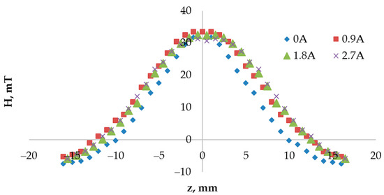 Figure 2 provides plots representing the axial component of the magnetic field intensity H created by a combined source comprised of a permanent annular magnet and an electromagnet as a function of the z coordinate. The middle of the annular magnet is taken as z = 0. Different markers correspond to different values of current in electromagnet I.