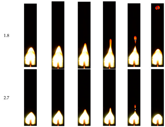 The obtained results show that active bubbles and droplets can be formed in the inhomogeneous field of an annular magnet by injecting a non-magnetic phase into the magnetic fluid. The separation of nonmagnetic droplets and bubbles occurs from a levitating nonmagnetic volume (Table 4 and Figure 3), unlike applying the flow focusing technique, which is one of the main techniques in droplet microfluidics [44] when it occurs from a capillary. In this case, the levitating gas cavity acts as a receiver, making it possible to stabilize the size of the detached bubbles and increase the adjustment range, in contrast to the data presented in [45], the in which detachment of bubbles in a magnetic fluid occurred in a uniform magnetic field.