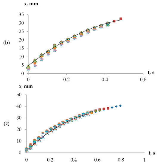Based on the data obtained in the LabView program, plots of the dependence of the coordinate x of the droplet movement on time t were drawn (points in Figure 4). The moment of droplet separation is chosen for the zero moments of time (the penultimate column in Figure 3).