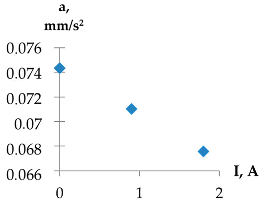 Figure 5 and Figure 6 show changes in the acceleration and velocity of non-magnetic liquid inclusions floating up depending on the strength of the current supplied to the solenoid.