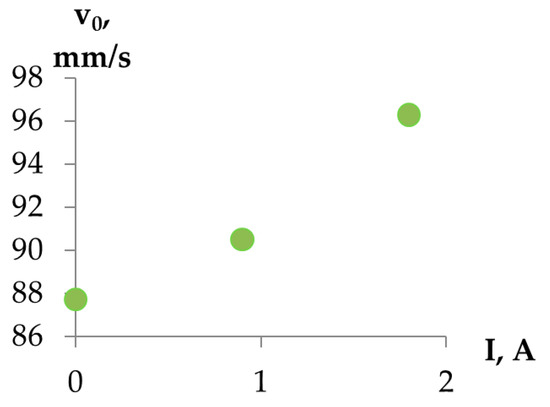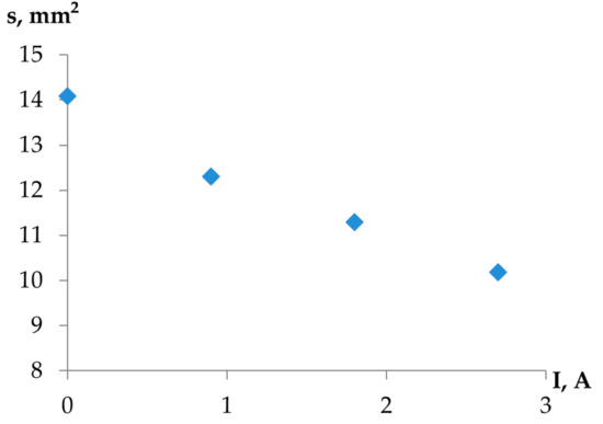 These dependencies are shown as solid curves in Figure 4. The values of acceleration a and the velocity v0 determined from Equation (1) for each curve in Figure 4 are presented in Table 6. The value of the cross-sectional area of the detached droplets is also presented for each value of the current in electromagnet I.