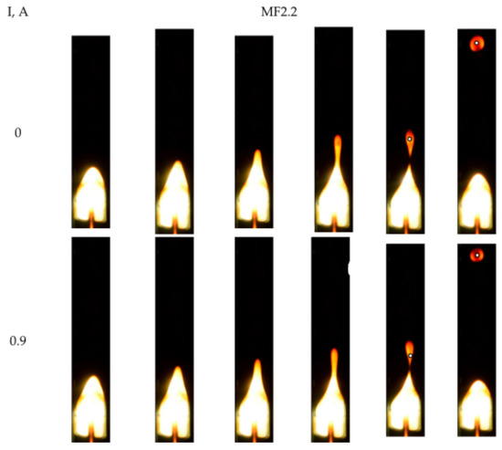 During the experiments, a droplet flow did not occur. In all given combinations of “MF-non-magnetic fluid”, the formation of a layer of a non-magnetic phase on the surface of the MF column was observed.