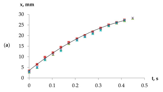 Based on the data obtained in the LabView program, plots of the dependence of the coordinate x of the droplet movement on time t were drawn (points in Figure 4). The moment of droplet separation is chosen for the zero moments of time (the penultimate column in Figure 3).