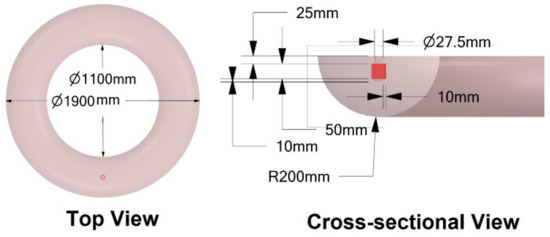 The Fukushima Daiichi is a BWR with Mark 1 containment, which consists of a drywell resembling an inverted lightbulb and a toroidal suppression pool chamber. The suppression pool has an inventory of 2980 m3 with a major diameter of 33.5 m and a minor diameter of 8.9 m. The reduced-scale torus has a main diameter of 1.5 m and a minor diameter of 0.4 m, with a volume of 0.592 m3 when half-filled with water. The current study employs the scaled-down suppression pool shape described in the literature [4]. The dimensions of the torus and steam condensation region (SCR) in this study are shown in Figure 1. In addition, a list of simulations performed in this study is provided in Table 1 as a simulation matrix.