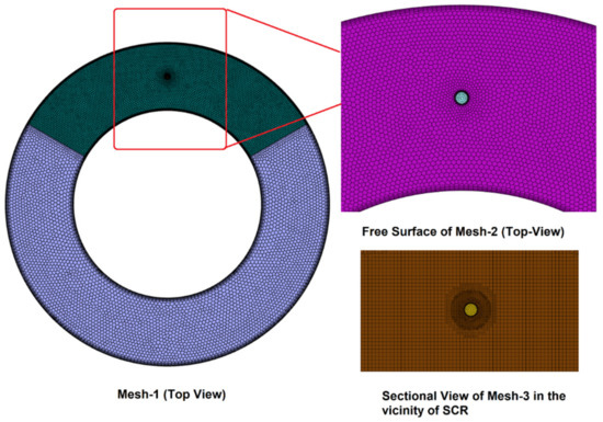 The average cell size in the SCR area is 5 mm for coarse mesh and 2 mm for fine mesh. Further, the torus area has an average cell size of 10 mm in a zone encompassing one-third of the sparger and 20 mm in the remaining two-thirds with the coarser mesh (case A), 10 mm for the medium mesh (case B), and 8 mm for the fine mesh (case C). All meshes maintained a minimum orthogonal cell quality of 0.5; for case C, over 99.8% and 97.9% of the cells had an orthogonal cell quality of above 0.8 and 0.9, respectively. In addition, the maximum observed skewness was 0.49, and 99.9% of the cells had skewness less than 0.3.