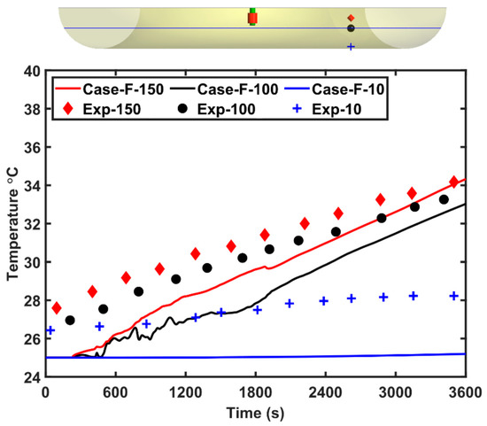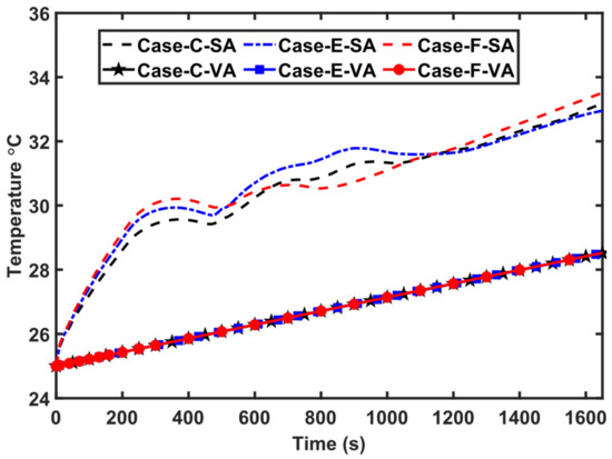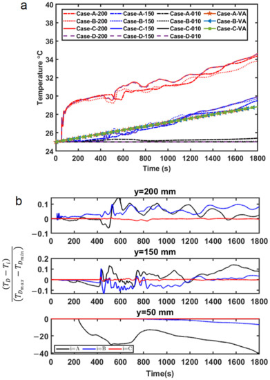 For ascertaining the effect of time step, initially, a time step of 0.01 s was chosen for up to 900 s, 0.05 s for 900 < t < 1000 s, and 0.1 s for 1000 < t < 1800 s for cases A–C. On a system with eight cores and 128 GB of RAM, the simulation for a fine mesh took around 10 days to complete. Later, a simulation (case D) was entirely run using a time step of 0.1 s. Using a constant time-step (case D) of 0.1 s does not influence the observed temperature variation as observed in Figure 3a; thus, a time step of 0.1 s was adopted for subsequent simulations.