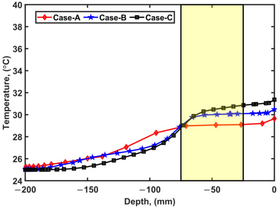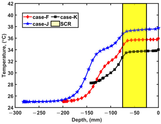 The effect of aspect ratio is brought out in this section by varying the cross-sectional width to the depth of the pool for the same amount of water volume in the pool. The aspect ratio is the ratio of cross-sectional width to depth. For an aspect ratio of 0.5, the cross-sectional width is reduced, and the depth is increased to preserve volume resulting in a deeper and narrower pool. For an aspect ratio of 2.0, it is the depth that is reduced at the expense of width resulting in a shallower and wider pool. The dimensions for different cases are given in Table 4. Figure 15 displays the form of the geometry, as well as temperature contours for these scenarios; Figure 16 shows the thermocline for the three cases. It may be noted that, in all the three cases (F, J, and K), the same volumetric heat source and submergence depth are maintained along with other simulation parameters. Figure 15 shows that the quantity of water not participating in the heat evacuation process is more significant in the case of a deeper pool or lower aspect ratio (case J) than in the situation with a shallower pool (case K). It can be seen in Figure 15 and Figure 16 that case K’s lowest temperature is around 28 °C with a negligible dead zone, whereas case J’s temperature rise is almost stagnant between 175 and datum level depths. Thus, the effect of stratification is more pronounced in a deeper pool.