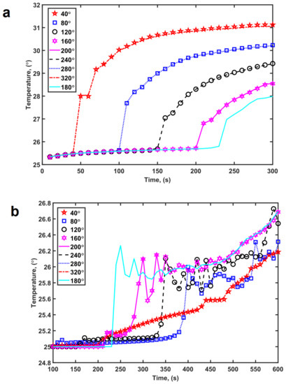 Temporal variation in temperature at points located circumferentially: (a) on the surface of the pool, (b) at a depth of 50 mm from the surface.