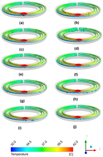 The streamlines determine the observed circulation pattern during the transient simulation when a stable flow pattern emerges. In addition to identifying the pool’s temperature, the streamlines comprise markers indicating the direction of movement. In summary, the facets of the tunnelling phenomenon consist of a heated plume rising from the region of the sparger (Figure 8a), expanding circumferentially (Figure 8b,c), sinking at the opposite ends of the sparger (Figure 8d), and returning to the sparger at a lower height (Figure 8e–j). Even though this is a basic description, the established flow pattern is more complicated, with several recirculation patterns and stagnant zones.