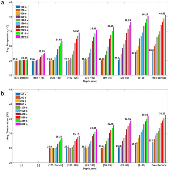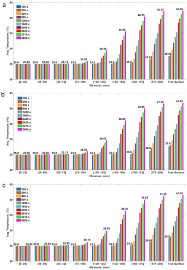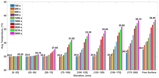 Figure 9 depicts the average temperature distribution in the pool with regard to elevation at different times. Throughout the 3600 s, the bottom-most zone, i.e., from 0 to 25 mm in elevation, saw just a 0.25 °C rise. This shows that the zone is not evacuating heat during the buoyancy-induced convection process and might be deemed a stagnant zone. In the highest zone, however, the temperature fluctuation is 13.15 °C, showing that this zone actively participates in the circulation process. In addition, if the initial pool temperature of 25 °C is considered, the surface temperature rose by 13.45 °C during the same period. The dead volume can be defined in terms of the temperature rise that it has undergone. If it is defined as the zone with less than a 20% rise in temperature (ΔT = 13.45 × 0.2 ≈ 2.7 °C) relative to the highest temperature difference (seen for free surface: ΔT ≈ 13.5 °C), the dead volume may be detected up to an elevation of 0–75 mm during the allotted period. (It may be noted that 2.7 °C corresponds to about 35% of the well-mixed temperature rise and, thus, even in terms of the average amount of heating up, the dead volume constitutes a considerable thermal inertia.) This dead volume represents about 35% of the pool’s overall volume. In addition, a considerable temperature change is detected in the zones between 75 and 200 mm, suggesting mixing.