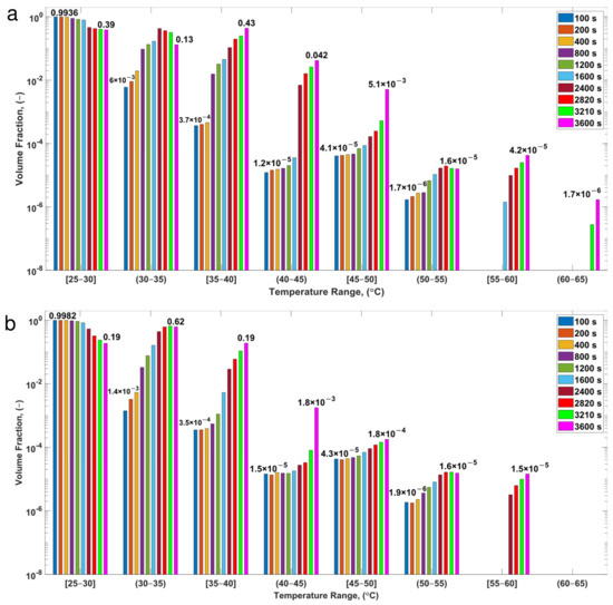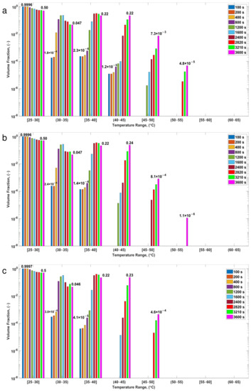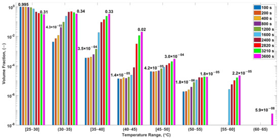 Figure 10 depicts the volume fraction distribution for a specific temperature range, from which the following conclusions may be drawn. After 3600 s, 31% of the pool water volume had a temperature increase of less than 5 °C, which is 2/3 of the volume-averaged, or well-mixed, pool temperature rise over this period. Secondly, much of the pool, or 34%, is between 30–35 °C. Similarly, at the end of the 3600 s, 30% of the water in the pool is between 35 and 40 °C, and 69% is between 30 and 45 °C. In the temperature range of 30–35 °C, a maximum volume fraction of 0.48 is found at 2820 s, falling to 0.41 after 3210 s. This decline results from the volume percentage of water in the higher temperature zones (35–40 °C) increasing with time. Additionally, water above 45 °C comprises less than 0.1% of the pool. This may be attributable to the fact that the higher temperature zones (>45 °C) are confined to SCRs with volumetric heat sources.