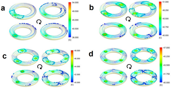 Figure 12a–d shows the streamlines emanating from the heat source at 3600 s, and the temperature difference between the hottest (above the heat source) and coldest (farthest location at the time of collision) points decreases with an increase in the number of sources. The maximum temperature declined from 51 °C to 47 °C as the number of sources increased, which is directly attributable to the reduction in the volumetric heat flow per source. The temperature difference decreased from 11 °C to 7 °C when the sources were increased from two to four as the buoyant plume’s temperature decreased to about 40 °C by the time of collision with an approaching front. Hence, this could be the reason for lower surface temperatures with heat sources increased from two to four. However, when it comes to a single source, though the maximum temperature on the surface is 54 °C as seen in Figure 12a, it has a longer traversing length until collision and, therefore, can dissipate more heat in the process, thereby reaching a substantially lower temperature of 36 °C. This could be the reason for the lower surface temperature for a single source compared to multiple heat sources.