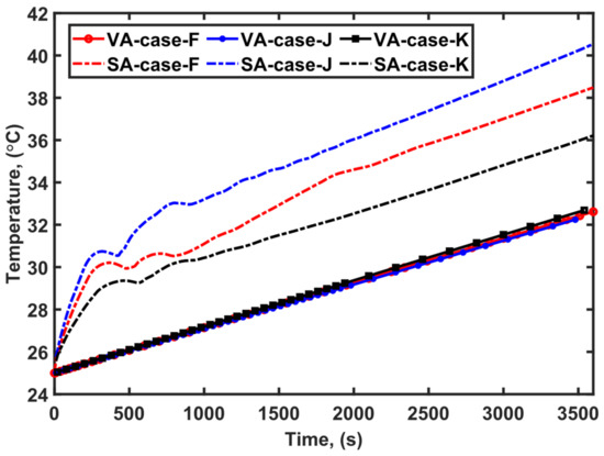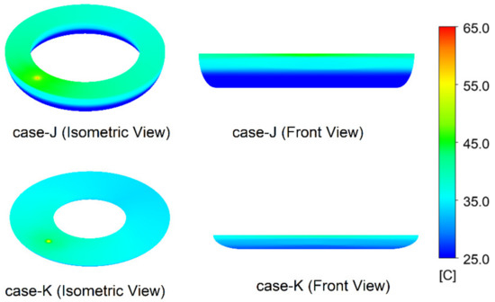 Temperature variation by the end of 3600 s for cases with an aspect ratio of 0.5 (Case J) and 2.0 (Case K).