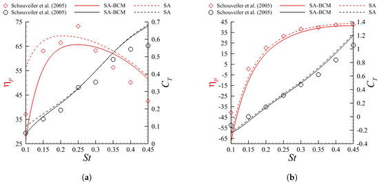 Propulsive efficiency and mean thrust coefficient as a function of the Strouhal number for (a) and (b). Experimental data digitized from [8].