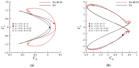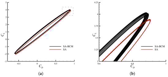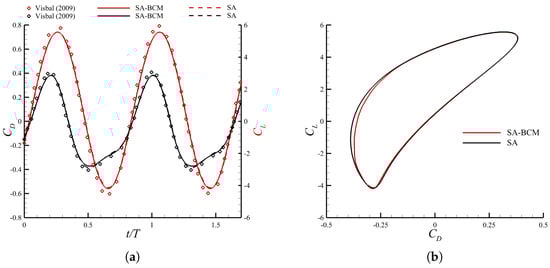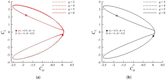For completeness, it is worth finally providing an example of the convergence study of the solutions here reported. Space and time resolution-independence have been guaranteed through a polynomial refinement of the space discretization q and the choice of the time step size . It should be noted that by raising the degree of the polynomial approximation, the order of accuracy of the solution increases, although this also corresponds to a significant growth in the number of degrees of freedom. For instance, moving from to , the total number of variables goes from 296,640 to 830,592. An increase by a factor almost equal to 3 in the dimension of the numerical problem may be observed as a result of such a raise in the polynomial-order approximation. The solutions’ accuracy was verified by examining the behaviour of both the average performance coefficients and the phase diagrams. For the sake of conciseness, in the following we only report the convergence results referring to the particular case with and . Its stringent requirement for high spatial and temporal resolutions due to the large makes it indeed a most challenging scenario. Considering the SA-BCM model, which presents relatively stricter accuracy constraints compared to the standard SA due to its algebraic modification, the average drag coefficient and efficiency have been observed to remain substantially unchanged throughout the performed space–time refinement: moving from and up to and , we have that ranges between and , whereas spans between and . In Figure 7, the phase diagrams for different polynomial approximations are reported over one cycle. It is easy to notice that for the results are almost indistinguishable. When only adopting SA-BCM, very small differences arise; however, as previously mentioned, with this model an imperfectly periodic behaviour of the solution is often observed, and small differences can be seen even between consecutive cycles performed at the same polynomial order, as will be further shown in Section 3.2.2. Note that another detailed space convergence study is also presented for the SD7003 profile in Section 3.2.2.