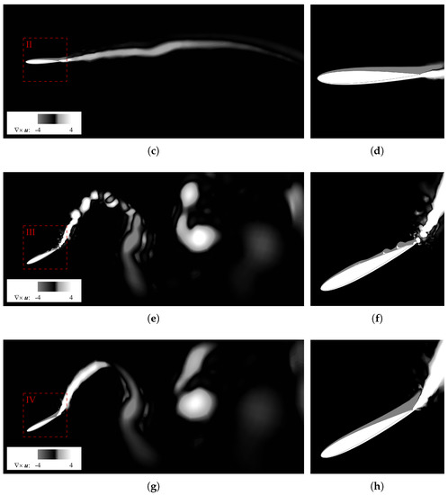 During the downward motion, the effective angle of attack increases as a consequence of the vertical velocity of the profile. In particular, substituting into Equation (4) leads to . This high value determines a boundary layer separation at the leading edge resulting in the formation of several LEVs trailing downstream.