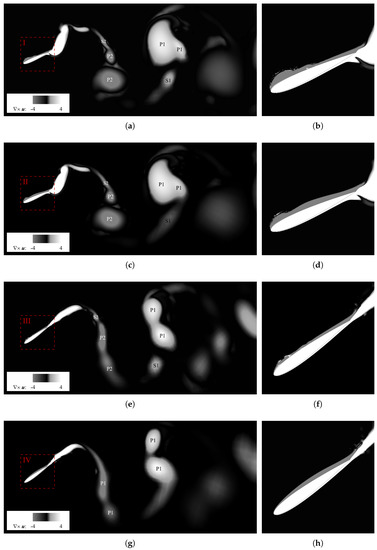 SA-BCM model. Contour of instantaneous spanwise vorticity. From top to bottom, the vertical positions are presented in the sequence: (a,b) ; (c,d) ; (e,f) ; (g,h) . The right column reports the details of the instability developing at leading edge.