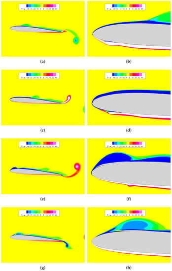 Finally, at the profile reaches the maximum velocity in its upstroke motion. The three-dimensional results [11,12] show the formation of complex vorticity organization over a large portion of the upper surface as a consequence of interactions between the profile and the previously formed vortex structures. In the SA-BCM model, such interactions seem to be captured in a more adequate manner with respect to the SA model, even though not exactly due to the two-dimensional nature of the simulation. By examination of Figure 9g,h, it is possible to observe the single leading-edge vortex being pushed towards the solid surface by the vertical, motion-induced velocity as it becomes advected downstream. As a consequence of this wall–vortex interaction, a region of positive-sign vorticity is formed and subsequently ejected into the fluid domain. The two-dimensional instantaneous vorticity contours derived via implementation of SA-BCM model appear to be in fairly good agreement with the planar vorticity distribution reported in [11,12]. On the contrary, in the SA case, Figure 10g,h, the situation is significantly different: the vorticity distribution is much smoother with respect to the three-dimensional findings. Moreover, the leading-edge vortex appears to be much more heavily diffused and stretched in the streamwise direction with only a small, positive vorticity region confined close to the solid wall. Further downstream, no visible sign of boundary-layer instability can be identified over the upper surface. The overall effect of the upward motion in the SA case is a compression of the boundary layer towards its bounding solid wall without generation of any clearly detectable instability.