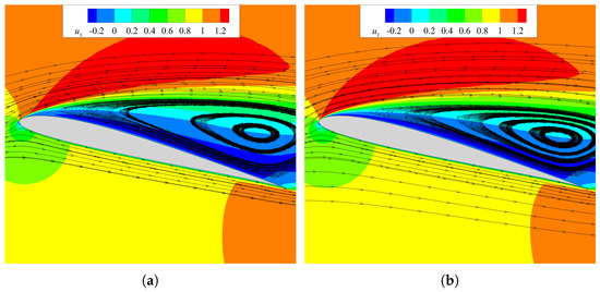 Figure 13 reports the mean streamwise velocity field of the two-dimensional case for both the SA and the SA-BCM models. The SA-BCM (Figure 13a) shows a significantly larger reduction in the size of the recirculation region behind the profile when compared with the corresponding effect given by the SA model in Figure 13b. Indeed, the local flow reattachment is a result of the interactions between the stall vortex detaching from the leading edge and the moving surface, so an adequate resolution of such structures appears to be fundamental for capture of an effective stall reduction. When adopting a fully turbulent SA model, instabilities are immediately sheared out by the turbulent stresses so that the mean flow strongly accelerates past the leading edge as a result, exhibiting a neat separation.