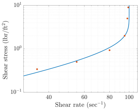 In this work, we consider the responses of types (2) and (3) since we have seen that they describe quite well the experimental flow curves of some dense suspensions. In particular, we consider Figure 4 and Figure 5, in which and are selected to fit the experimental curves of two types of suspensions, namely a TiO suspension in Figure 4 and a cornstarch suspension in Figure 5. The experimental data in Figure 4 and Figure 5 are taken from [1,16] respectively. This paper is devoted to the study of some simple shear flow of fluid with a constitutive law of types (2) and (3). In particular, we focus on three types of flow, i.e., (i) planar channel flow; (ii) the flow between coaxial cylinders; and (iii) the flow down an inclined plane. Despite the nonlinearity of (3), we shall see that in all geometrical settings considered in this paper, it is always possible to determine an analytical steady-state solution. For each problem, the flow equations are scaled appropriately so that the velocity field can be expressed in terms of the Reynolds number and other non-dimensional material (i.e., not depending on the flow) parameters. Because of the boundedness of the shear rate, in some geometrical settings, the Reynolds number happens to be bounded, meaning that the range of velocities that can be attained by increasing the force that drives the motion is limited. This is consistent with the shear thickening and limited strain nature of the fluid, where friction forces between layers (viscosity) grow with the shear stress, preventing the velocity from increasing unboundedly. Models of types (2) and (3) are useful because one can explicitly determine the velocity and stress profiles in the simple flow, but also because they allow approximating the DST models by avoiding the intrinsic singularities in the constitutive equations.
