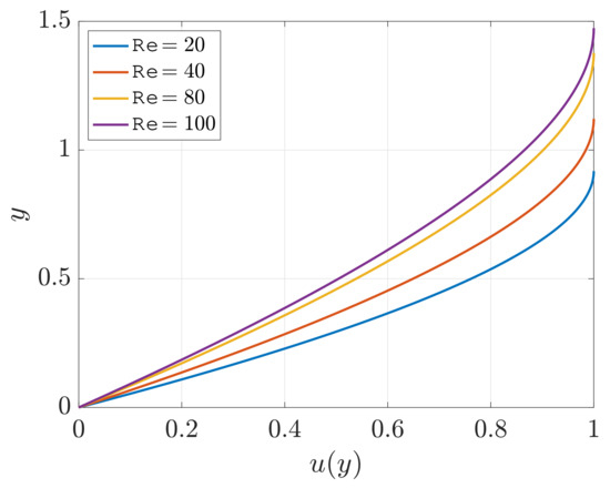 From the inequality in (17), we realize that the Reynolds number is bounded for this type of flow since from relation (16), the velocity . In particular, and are functions of the Reynolds number. Inserting (15) into (14), and rearranging, we finally find the velocity field expressed in terms of the Reynolds number
