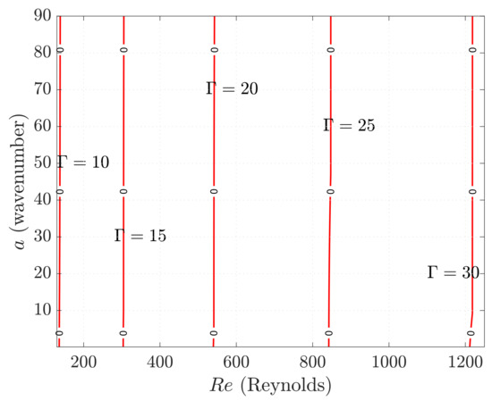 where and are defined in Equations (47) and (48), respectively. The boundary conditions are . Equation (50) is solved via a spectral collocation method based on Chebyshev polynomials. Notice that because of the particular constitutive equation considered here, the classical Orr–Sommerfeld equation cannot be recovered from (50). In Figure 9, we plot the neutral stability curves for some values of , while in Figure 10, we display the critical Reynolds number as a function of the parameter . Notice that the critical Reynolds number is always below the limit , which is the upper bound of , see Section 2.1. In particular, we observe that the deviation of from the limit value increases with .