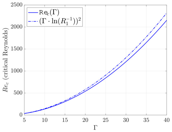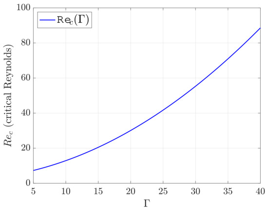 In Figure 13, we plot the approximation of the marginal stability curves (valid for small ) for , and with . These are clearly vertical straight lines in the plane that provide the critical Reynolds above which we have instability. The dependency of the critical Reynolds number as a function of is depicted in Figure 14.
