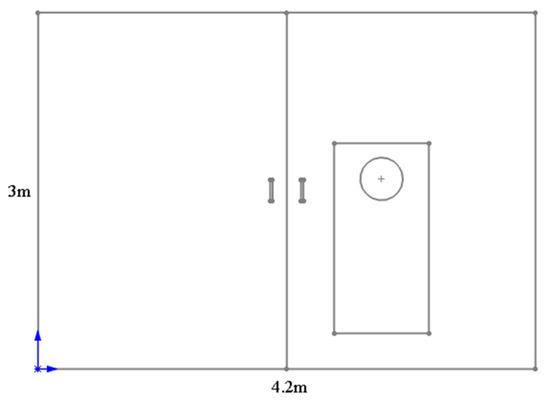 Without considering the relationship between the personnel door’s position and the roadway’s space and height, the simplified two-dimensional roadway model is used to improve the calculation accuracy of the model. Referring to the size of the main ventilation roadway in the coal mine, a two-dimensional roadway model with a length of 40 m and width of 5 m is established, as shown in Figure 3. Set the distance from the personnel door from the center of the roadway at 200 mm, 400 mm, 600 mm, 800 mm, and 1000 mm; the model size scheme is shown in Table 5.