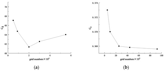 Since the number of grids directly affects the accuracy of calculation results, it is necessary to test the grid independence. The two-dimensional model and the three-dimensional model are divided into different numbers of grids, and the resistance coefficient cd value is used as the evaluation index to check the grid independence. The grid independence test results are shown in Figure 2. In the two-dimensional model, as the number of grids increases, the cd value decreases first and then increases. When the number of grids is 19,916, the cd value is the smallest and the orthogonal quality of the grid is the best. In the three-dimensional model, when the number of grids increases from 476,026 to 2,521,485, the change of the cd value is large, and when the number of grids increases from 2,521,485 to 9,221,527, the change of the cd value is small. Therefore, to reduce the consumption of computer resources and time, the number of grids selected for the two-dimensional model is 19,916, the number of grids selected for the three-dimensional model is 2,521,485, and the grid size is 0.1 m.