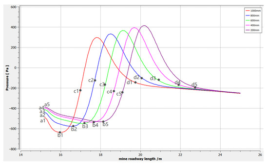 There are two air-pressure areas, approximately ‘oval’ and ‘semi-circular arch’ at the leeward of the air door with the personnel door. To intuitively see the trend of change, a straight line is selected at the near wall of the roadway. As shown in Figure 6, the overall trend of the air-pressure change curve in the length direction of the roadway at the leeward of the personnel door is roughly the same. When the personnel door is ≥800 mm from the center of the roadway, the ab section of the curve is steep, indicating that the air pressure changes greatly. The ac section of each curve is an ‘oval’ air pressure area, and the closer the personnel door is to the middle line of the roadway, the larger the area is; the ce section is a ‘semi-circular arch’ air pressure area, and the closer the personnel door is to the middle line of the roadway, the larger the area is; in short, it can also be seen from the ae section of each curve that the closer the personnel door is to the middle line of the roadway, the larger the two air-pressure areas at the leeward side of the personnel door. From the air-pressure contour line at the personnel door in Figure 7, it can be seen that, when the distance between the personnel door and the middle line of the roadway changes from 200 mm to 1000 mm, the maximum air-pressure value gradually increases, and the variable range of air pressure near the windward side of the personnel door decreases from 13.65~13.02 m, and the change range of 200~400 mm is only 0.06 m; the variable range of air pressure near the leeward side decreases from 15.86 m to 15.57 m, and the difference between the range of 400 mm and 200 m from the personnel door to the middle line of the roadway is twice that of 400 mm and 1000 mm.
