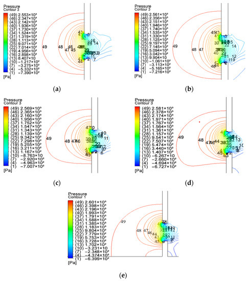 Pressure cloud diagram of different personnel door positions at the same air speed. (a) 200 mm; (b) 400 mm; (c) 600 mm; (d) 800 mm; (e) 1000 mm.