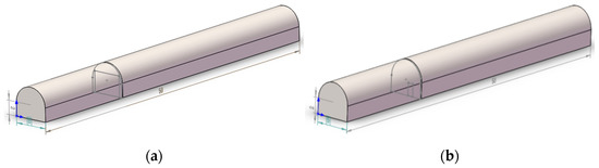 According to the actual size of the main underground ventilation roadway, a three-dimensional semi-circular arch roadway model with a length of 50 m, a width of 5 m, and a height of 4.5 m is established in Solidworks according to a certain proportion. In the case of not affecting personnel and opening to traffic and removing the door frame, the wide door is designed to be 3 m high and 4.2 m wide; the personnel door is 1.6 m high and 0.8 m wide, and 0.3 m from the bottom. The thickness is set to 0.2 m by using the resection-stretch and tab-stretch functions. The model after the wide door is opened is shown in Figure 9a. The model after the personnel door is opened is shown in Figure 9b. The model size scheme is shown in Table 8.