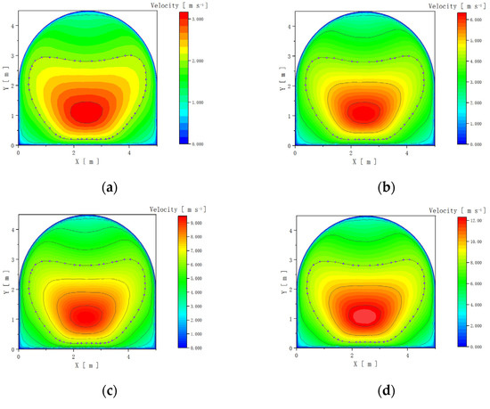 According to the ‘Coal Mine Safety Regulations’ (2022 Edition), the maximum allowable air speed of the main underground intake and return airways is 8 m/s. Therefore, this paper simulates the roadway air-speed distribution under different air speeds of 2 m/s, 4 m/s, 6 m/s, and 8 m/s. Select the air door behind the 5 m, 10 m, 15 m, 20 m, 25 m, and 30 m roadway cross-section, and observe the change law of air speeds, as shown in Figure 11, and the air-speed distribution of the roadway cross-section. Figure 11a–d shows that the velocity profile at 25 m outside the door does not change with the inlet conditions. The air-speed profile in the middle of the roadway is similar to the shape of the wide door. Due to the blocking of the wide door, a ‘zero circle’ area appears at the top of the roadway. The farther away from the wide door, the area gradually shrinks to disappear. Figure 11 shows that the air-speed changes greatly within 25 m after the air door; the changing trend of air speed in the roadway outside 25 m is gradually stable, and the air-speed contour lines tend to be consistent. From the velocity cloud diagram at different positions of the personnel door in Figure 8, it can be seen intuitively that the 25 m behind the personnel door has avoided the air-speed concentration area. Therefore, the influence of different air speeds on the position of the anemometer is analyzed at the 25 m cross-section.