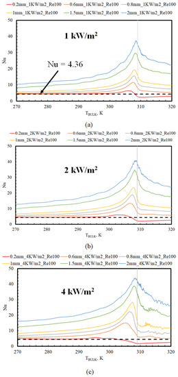 - For TBULK < 285 K: Thermophysical property variations are gradual in this region (cf. Figure 1a). Therefore, the local Nu should ideally approach the value of 4.36 corresponding to fully developed, constant property, laminar flow conditions (indicated by the horizontal dotted lines in Figure 2 and Figure 3). Further, this should be independent of inlet Re, tube diameters, or the imposed fluxes. However, Nu was close to 4.36 in this region across all fluxes only for the tube diameter of 0.2 mm and for diameters less than 1.5 mm when the inlet Re was 400. This indicates that the buoyancy to convection effects are larger with a lower inlet Re and larger tube diameters, as expected from Equation (9). At larger tube diameters and lower inlet Re (>0.2 mm and >1.5 mm for Re 100), the local Nu in this bulk temperature region was greater than 4.36, indicating that buoyancy is augmenting the heat transfer rates. In addition, the Nu is also a function of tube diameter (D) and the imposed heat flux (Q), as seen in Figure 2 and Figure 3. This is attributed to larger differences in wall and bulk fluid properties at larger heat fluxes and the strong dependence of Gr on the tube diameter (cf. Equation (10)).