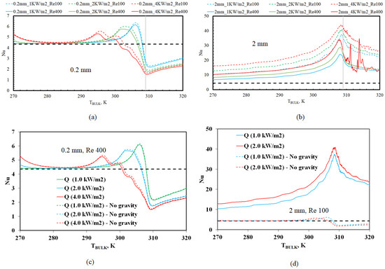 Nu versus bulk temperature (TBULK) in: (a) 0.2 mm diameter tube at different inlet Re and heat fluxes; (b) 2 mm diameter tube at different inlet Re and heat fluxes; (c) 0.2 mm diameter tube, with and without gravity effects; (d) 2 mm diameter tube, with and without gravity effects.