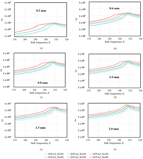 Gr versus bulk temperature (TBULK) at different tube diameters: (a) 0.2 mm; (b) 0.6 mm; (c) 0.8 mm; (d) 1.0 mm; (e) 1.5 mm; (f) 2 mm.