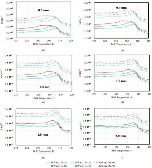 However, Figure 5 shows that downstream of TPC (~309 K), Gr gradually reduces, indicating that the difference between the wall and bulk temperature and the densities are gradually decreasing as well. While this should result in an augmentation in heat transfer and Nu (cf. Equation (6)), Figure 2 and Figure 3 show that at TBULK > TPC, Nu also decreases (similar to Gr), suggesting that Nu is proportional to Gr in this region as well. The fact that Nu decreased, in spite of the lower (TBULK − TWALL) in this region, may be understood based on the fact that the highest ReBULK values for each scenario are also found in this region (since viscosity also reduces when TBULK > TPC). Therefore, Gr/Re appears to be a criterion for buoyancy-induced heat transfer augmentation in this region. Based on the review of various buoyancy criterion [9], the magnitude of Gr/Re2.7 versus bulk temperature (TBULK) at different tube diameters was computed, and the results are shown in Figure 6. It is worth recalling that buoyancy effects were deemed to start becoming important at a tube diameter of 0.2 mm only when the inlet Re was 100, but not at an inlet Re of 400 (cf. Figure 4a,c). This suggests that Gr/Re2.7 > 10−4 (Figure 6a) may be employed as a criterion for which buoyancy augmented laminar heat transfer rates may be expected. This is an order of magnitude higher than the Gr/Re2.7 > 10−5 criterion that is employed to assess buoyancy effects in the turbulent regime [9].
